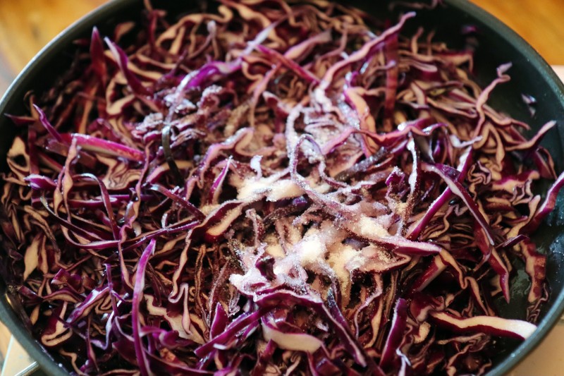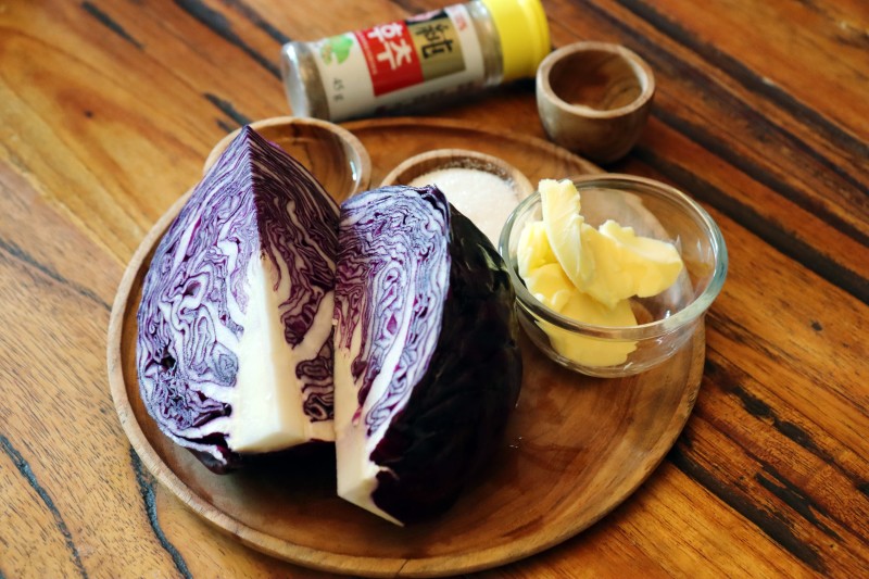 적양배추 600g, 버터 40g, 소금 1ts, 식초 5Ts, 설탕 5Ts, 후춧가루 약간