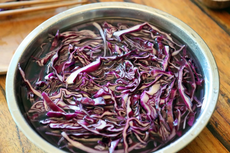 2. 자른 적양배추는 찬물에 10분 정도 담가 준후, 여러 번 씻어 물기를 제거합니다.